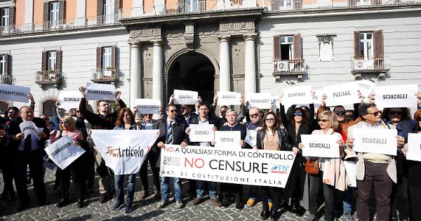 NAPOLI. Giornalisti in piazza per #GiùLeManiDallInformazione, il flash mob promosso dalla Federazione nazionale della Stampa Italiana a cui ha aderito il Consiglio dell'Ordine nazionale dei Giornalisti che si è svolto in contemporanea in diverse piazze d'Italia. La manifestazione a Napoli si è svolta in piazza del Plebiscito, dinanzi agli uffici della Prefettura. Alcuni giornalisti hanno esposto striscioni e cartelli con le frasi pronunciate nei giorni scorsi del vicepremier Luigi Di Maio e da Alessandro Di Battista. "Siamo qui in piazza a Napoli, come in diverse altre piazze d'Italia, per dire no a chi vuole mettere il bavaglio alla stampa, a chi vorrebbe leggi liberticide per attaccare sia il nostro Ordine che i giornali", ha detto il segretario del Sindacato Unitario Giornalisti Campania, Claudio Silvestri. "C'è un violento attacco alla categoria, nei confronti dell'informazione e di chi fa informazione. A rischio estinzione, con l'annunciato taglio dei fondi per l'editoria, ci sono innanzitutto le piccole testate", ha spiegato invece il presidente dell'Ordine dei Giornalisti della Campania, Ottavio Lucarelli. "Gli insulti da parte di esponenti del Governo e del M5S non scuotono l'amor proprio e la dignità di una professione, ma minacciano la libertà e i diritti costituzionali: vogliono eliminare ogni forma di intermediazione rappresentata da giornali", ha rilanciato il consigliere nazionale della Fnsi, Gerardo Ausiello.