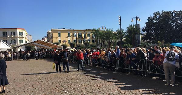 POMPEI. Sono stati 35mila i fedeli che ieri hanno sostenuto ore di fila per baciare il quadro della Beata Vergine del Santo Rosario a Pompei. La storica tradizione della Discesa della sacra effigie, venerata nella città mariana, è un appuntamento speciale per tutti i devoti della Madonna. Il Quadro viene posto dinanzi all’altare, dove rimane fino a notte fonda, quando anche l’ultimo fedele presente in Santuario avrà potuto baciarla.