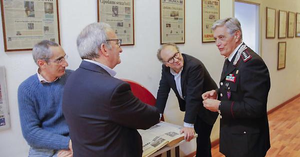NAPOLI. Il comandante interregionale dei Carabinieri, generale Vittorio Tomasone, è stato in visita giovedì pomeriggio nella redazione del “Roma” per un cordiale scambio di opinioni e per anticipare gli auguri di Natale. Ricevuto dal direttore editoriale Antonio Sasso, dal direttore responsabile Pasquale Clemente e dal vicedirettore Roberto Paolo, il generale ha visitato tutta la redazione intrattenendosi con i giornalisti dei vari settori. Si è in particolare soffermato nell’archivio del giornale dove ha ripercorso alcune delle più brillanti tappe della sua carriera di investigatore di rango sfogliando i numeri del “Roma” dei primi anni ’90, in cui venivano riportate alcune operazioni anticamorra da lui dirette. Tomasone, infatti, 63 anni, nativo di Altavilla Irpina, che nel gennaio 2018 ha assunto il comando interregionale dell’Arma, ha svolto gran parte della sua carriera proprio a Napoli, dove ha prestato servizio prima nelle compagnie di Napoli Centro, Poggioreale e Vomero, e in provincia (è stato a capo della compagnia di Pozzuoli negli anni ’80), per poi prendere il comando del Nucleo investigativo dei carabinieri. Tanti gli aneddoti ricostruiti dal generale con la redazione, riguardanti sia le più delicate inchieste di quegli anni tra malavita organizzata e malaffare politico, sia i rapporti con le maggiori firme del giornalismo napoletano dell’epoca. Nell’occasione è stato donato al generale Tomasone l’annullo filatelico emesso da Poste Italiane in occasione dei 150 anni di vita del quotidiano “Roma”.