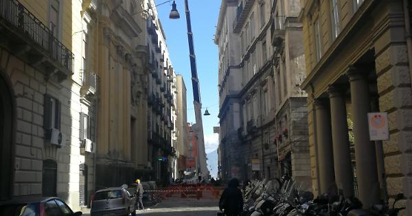 NAPOLI. Chiusa via Chiatamone dove questa mattina si provvede a spicconare la facciata della chiesa delle Crocelle, da cui ieri sera si sono staccati alcuni calcinacci che hanno danneggiato le auto in sosta lungo la strada, ma non hanno fortunatamente provovato feriti. Il lavoro dei tecnici è supportato dagli agenti della polizia municipale per evitare riprercussioni sul traffico di via Arcoleo e della Galleria Vittoria.