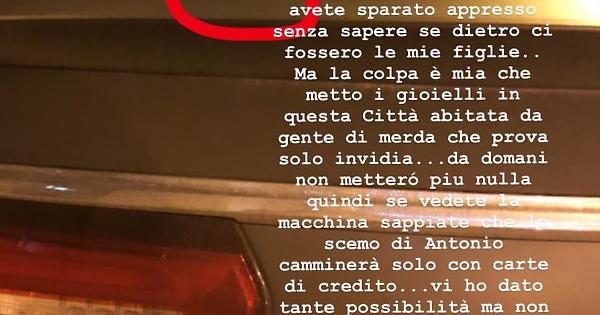 NAPOLI. «Per la seconda volta mi sparate appresso senza considerare che potevano esserci le mie figlie. Ma la colpa è mia che metto i miei gioielli in questa città abitata da gente di merda che prova solo invidia. Non metterò più nulla, quindi se vedete la macchina sappiate che camminerò solo con carte di credito». Così su Instagram Antonio Vacca, giocatore napoletano della Casertana in prestito al Parma. I fatti si sono verificati questa notte, a Napoli, nel quartiere di Secondigliano, dove vive con la famiglia.