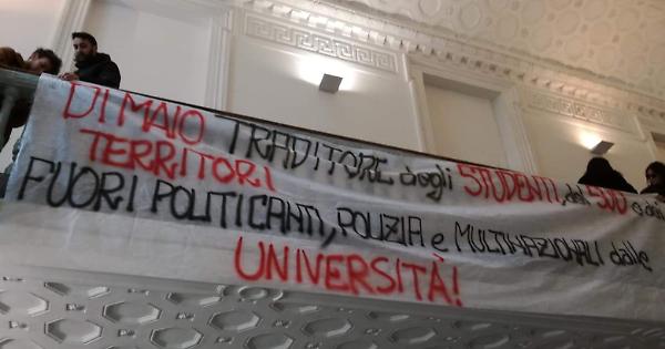 NAPOLI. Salta l'intervento del vicepremier Luigi Di Maio, previsto oggi alla Federico II nell'ambito di un incontro con le associazioni antiracket. Studenti dei collettivi della Federico II e de L'Orientale e centri sociali hanno, infatti, occupato l'ingresso dell'aula magna. «Non accettiamo in nessun modo la presenza di speculatori e politicanti come Di Maio all'interno dell'università - spiegano gli studenti -: il M5S, dopo aver fatto il pieno di voti al Sud, ha disatteso tutte le promesse elettorali fatte. Non solo ha dato vita al governo più reazionario della storia della Repubblica insieme alla Lega di Matteo Salvini ma ha anche tradito tutte le promesse in merito alla Tav, al Tap, all'Ilva e a tutte le battaglie ambientali che hanno sfruttato per il loro tornaconto elettorale». «Fuori i traditori del Sud dalle nostre università - questo lo slogan della protesta -. Gli studenti e le studentesse di Napoli non vi vogliono».