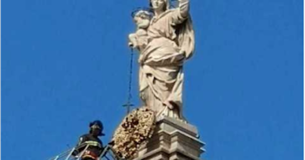 I vigili del fuoco sono saliti fino in cima alla Basilica e lo hanno ritrovato nella corona dell'omaggio floreale deposto proprio da loro ai piedi della statua. Il rosario, una pesante corona in pietra, è stato recuperato e quindi risistemato nella mani della statua della Vergine.