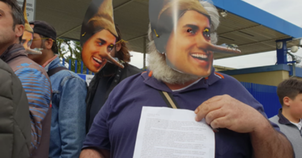 POMIGLIANO D'ARCO. I cinque operai licenziati dalla Fca di Pomigliano d'Arco, due dei quali autori della recente protesta sul campanile della chiesa del Carmine a Napoli, si sono presentati all'esterno dello stabilimento Avio Aero di Pomigliano dove era atteso l'arrivo del vicepremier e ministro del Lavoro e dello Sviluppo economico Luigi Di Maio. Gli operai indossano una maschera di Pinocchio con il volto di Di Maio ed espongono uno striscione con la scritta: "Il reddito di cittadinanza per i licenziati non c'è".