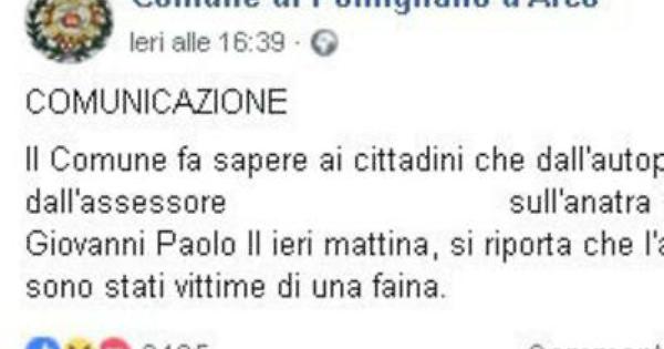 POMIGLIANO D'ARCO. «CSI a Pomigliano d'Arco». È uno dei tanti commenti al post del Comune partenopeo dal titolo “Comunicazione" che, su Facebook solo da ieri sera, sta già diventando virale. «Facciamo sapere ai cittadini», si legge sulla bacheca che «dall'autopsia», fatta effettuare «sull'anatra uccisa nel parco San Giovanni Paolo II si riporta che l'animale e i suoi piccoli sono stati vittima di una faina». «Spero che la faina possa difendersi nelle sedi opportune», scrivono chiedendo a gran voce a suon di emoticon chi «una controperizia» e chi, ridendo, «boschi chiusi». «È uno scherzo? Dimmi di sì», «sto sognando?», si interrogano, ringraziando della segnalazione «grazie per averci taggato» e affollando di “Mi piace" la pagina social del Comune.