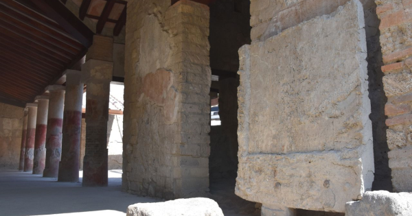 LA VILLA. La villa, che presentava anche un piano superiore, è databile nel suo impianto originario al I sec. a.C. e fu ampliata in almeno due fasi successive in età augustea e giulio-claudia. Nel portico, durante lo scavo, sono state rinvenute tracce evidenti nel terreno, in una stradina adiacente alla villa, di solchi lasciati dalle ruote di un carro da trasporto. Il piano di calpestio dell'area circostante la villa è costituito dal terreno agricolo del 79 d.C., che conserva le tracce delle antiche coltivazioni e di cui sono stati eseguiti i calchi delle radici di vite. Accanto ad esse sono state ripiantate le viti per la ricostruzione dimostrativa dell'impianto del vigneto. Lungo le pareti dello scavo la stratigrafia del terreno mostra chiaramente la successione dei depositi di materiale piroclastico determinati dall'eruzione del 79 d.C. che causò la distruzione della piccola fattoria.