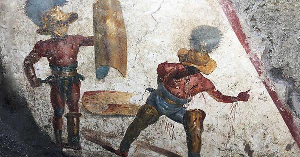 POMPEI. Due gladiatori al termine del combattimento, l’uno vince l’altro soccombe. È la scena dell’ultimo affresco rinvenuto a Pompei nell’area di cantiere della Regio V, nell’ambito dei lavori di messa in sicurezza e rimodulazione dei fronti di scavo, previsti dal Grande Progetto Pompei.