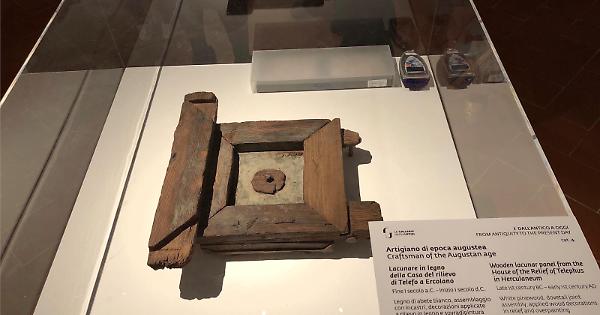Resterà visibile fino all’8 marzo nella mostra al primo piano della Galleria degli Uffizi il rarissimo lacunare ligneo di età romana, scoperto di recente ad Ercolano e mai esposto al pubblico, preservato sotto il compatto strato di fango dell’eruzione del 79 d.C.