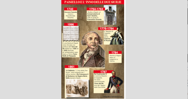 Quando un popolo si raccoglie intorno ad una bandiera, quando vuole esprimere la propria unità, la propria specificità e la propria individualità, quando vuole rafforzare la propria identità nazionale e quando vuole esprimere il proprio senso della Patria, è assai probabile che lo faccia anche attraverso la musica e, almeno da un paio di secoli, attraverso gli inni musicali. Ogni Paese possiede un inno, al pari della bandiera, con un testo poetico strettamente legato ad importanti avvenimenti storici del Paese stesso. Carattere e andamento solenne distinguono gli inni monarchici; ritmo di marcia e un generale andamento ritmico vivace caratterizzano gli inni repubblicani. Oggi gli inni nazionali sono 193. Trattandosi di composizioni destinate a pubblici eventi, cui presenziare in piedi, la loro durata varia generalmente tra il minuto e il minuto e mezzo. La prima composizione risale al IX secolo, quando il Giappone adottò uno Inno in omaggio al suo imperatore. Ma tracce musicali non se ne hanno poiché è andato perduto. Con un salto di secoli, il Paese in cui è nato l’inno moderno è la Gran Bretagna, nel 1745. Caratterizzato da una scrittura musicale di natura maestosamente religiosa, divenne subito l’Inno sia britannico che tedesco e tale rimase fino al 1922. Successivo al primo inno anglo-tedesco fu quello spagnolo: un inno-marcia, donato al re di Spagna dal re di Prussia. Il nome del compositore, certamente straniero, è rimasto ignoto fino a quando, nel 2012, il governo spagnolo ha ufficialmente dichiarato che Federico II, nella veste di compositore, ne sia stato l’autore, avendone poi lo stesso fatto dono al re di Spagna. Momento capitale nella storia degli Inni è stato quello della Rivoluzione francese. L’Inno francese, certamente il più celebre al mondo, “La marsigliese”, è una solenne marcia adottata come inno ufficiale nel 1795 e diffuso, grazie a Napoleone, in tutta Europa. La sua celebrità è stata tale che risulta essere citato (unico caso tra tutti), o “vagamente rievocato”, in ben 16 composizioni, da Schumann a Wagner, da Liszt a Čajkovskij. Circa 10 anni prima de “La Marsigliese”, nel 1787, il Re Ferdinando IV commissionava a Giovanni Paisiello la realizzazione dell’inno nazionale, divenendo così il regno napoletano il primo Stato italiano a disporre dell’inno nazionale ed entrando nel ristretto numero delle nazioni il cui inno era opera di un compositore prestigioso. Insieme con l’Inno che ufficialmente Haydn compose nel 1797 come Inno imperiale austriaco (poi passato alla Germania), utilizzando non già una melodia austriaca ma un tema popolare croato, e insieme con l’Inno di Charles Gounod, che con la Marcia pontificia, dal 1 gennaio del 1950 sarà il compositore dell’inno ufficiale del Vaticano, quello di Paisiello è uno dei pochissimi esempi di Inni composti da musicisti di grande valore. L’Inno di Paisiello, nella tonalità di fa maggiore, è una lenta marcia, solenne e maestosa.