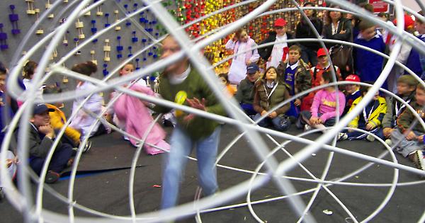 In linea con il tema 2015 del Festival, “Alfabeto del mondo”, lunedì, bambini e ragazzi del territorio campano saranno invitati a Creare mondi, a partire dalla struttura fantasmagorica Pallamondo, mondi che prenderanno forma attraverso l’unione di materiali e parole. Sulle gigantesche Pallemondo (nella foto), ispirate alla Houseball degli storici esponenti della Pop Art Claes Oldenburg e Coosje van Bruggen, confluiranno alfabeti differenti, espressione di lingue e comunità diverse, insieme al segno-simbolo del Terzo Paradiso del maestro Michelangelo Pistoletto. Inoltre, in un ideale collegamento con opere esposte al Madre, alcune Pallamondo verranno inoltre rivestite con materiali di tipi diversi, in riferimento alla pratiche di tessitura, rete, intreccio: stracci e vecchi abiti che richiamano la Venere degli stracci di Michelangelo Pistoletto, e nastri colorati e filamenti trasparenti che evocano l’opera La leggenda del Sardus Pater di Maria Lai Saranno costruiti così 9 Pallamondo, allestite e movimentate infine, nel cortile del museo, in forma di Terzo Paradiso.