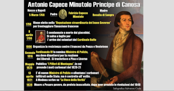 L’Opera omnia del Principe di Canosa sarà pubblicata. Al progetto editoriale (10 volumi, per oltre 4 mila pagine complessive, con scritti inediti e gli epistolari) lavora lo studioso Gianandrea de Antonellis, dell’Università del Molise. Il primo volume uscirà entro il 2020 con l’editore Solfanelli di Chieti. Abbiamo chiesto al curatore se gli inediti serviranno a smentire la “leggenda nera” su Canosa. «Esistono due tipi di inediti - spiega de Antonellis - quelli propriamente detti, cioè i manoscritti, e i testi pubblicati nel ’700 e ’800 e ora dimenticati. Certamente entrambi permettono di superare il giudizio della propaganda risorgimentale. Ma anche l’opera più nota, “I pifferi di montagna”, con i suoi ricordi del periodo giacobino e murattiano, dimostra che egli fu tutt’altra persona che il feroce Ministro di Polizia che ci è stato dipinto».