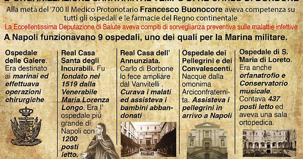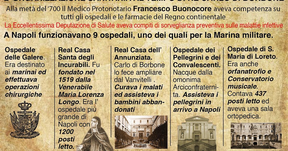 Alla metà del ’700, il re Carlo di Borbone fece nascere una struttura ospedaliera nel Regno di Napoli, intesa non solo come luogo di accoglienza caritatevole, ma di cura delle malattie. A capo dell’Organizzazione Sanitaria era il Medico Protonotario, incarico - negli anni ’50 del 1700 - rivestito dal dottor Francesco Buonocore, medico personale del re, che aveva “il compito e l’autorità di visitare tutte le Speziarie di Medicine di questa Città, suoi Borghi e Distretti per il bene pubblico, con destinare ancora i sostituti alle visite delle altre Speziarie del nostro Regno”. Buonocore era paragonabile al Ministro della Sanità per le funzioni, conferitegli direttamente dal re, ed aveva competenza nella gestione di tutti gli ospedali del Regno, al di qua del Faro, e delle Farmacie. La Eccellentissima Deputazione di Salute aveva compiti di prevenzione sulle malattie infettive che prevedevano la possibilità di isolamento a Nisida. Dopo la quarantena, a chi risultava sano, veniva rilasciato il passaporto di salute, che permetteva la libera circolazione nella città di Napoli e in tutto il Regno. Un compito analogo a quello della Deputazione di Salute era svolto, per il personale di Marina, dall’Ospedale delle Galere, che aveva un suo Medico Protonotario. L’ospedale svolgeva anche attività chirurgica e disponeva di 100 posti letto, di cui il 20% destinato ai marinai e l’80% ai galeotti feriti durante le scorrerie piratesche. Nel 1743, Carlo di Borbone fece attrezzare ad ospedale un palazzo al Borgo di Chiaia, acquistato dal Marchese di Pende, e ne ricavò circa 80 posti letto.