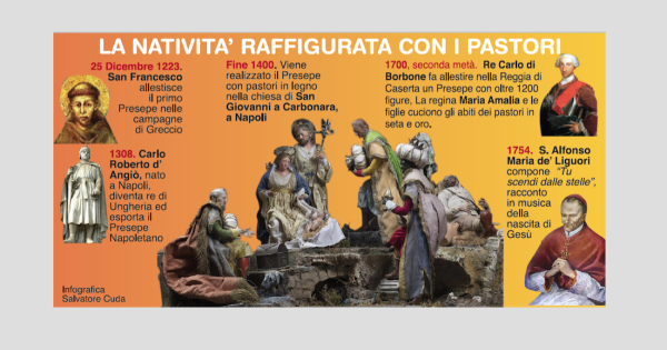 Da quel 25 dicembre 1223, quando san Francesco allestì il primo, nella campagna di Greccio, il presepe è divenuto la tradizione natalizia cattolica più diffusa al mondo. Tradizione popolare presto nobilitata a vera e propria forma d’arte, che ha trovato a Napoli una dimensione del tutto particolare, divenendo parte non secondaria del patrimonio storico, artistico e culturale della città, tanto da far dire al famoso collezionista Michele Cuciniello che «il presepio è Vangelo tradotto in dialetto partenopeo». Nel corso dei secoli, scultori e ceramisti di fama si sono dedicati all’arte presepiale, considerata non certo un’arte minore se il re Ferdinando I di Borbone decise di donare al Re di Spagna, suo fratello Carlo IV, due pastori, un uomo e una donna simbolo dei “possedimenti di qua e di là dal faro”, cioè del Regno delle Due Sicilie, che ancora oggi fanno parte del tesoro della Corona spagnola. Quasi a riprova della loro napoletanità, i Sovrani delle Due Sicilie amarono molto il presepe. Carlo di Borbone ne faceva allestire uno, nella Sala Ellittica della Reggia di Caserta, composto da oltre 1.200 figure - i cui abiti erano cuciti personalmente dalla regina Maria Amalia e dalle dame di Corte - che rimaneva esposto fino al 2 febbraio, la Candelora, giorno in cui secondo la tradizione i re Magi partirono da Betlemme. La ricchezza simbolica e allegorica del presepe napoletano è il felice risultato dell’ ingegno degli artigiani locali e del carisma spirituale di molti santi, in particolare di Sant’Alfonso Maria de’ Liguori (1696-1787), che con le sue Cappelle serotine, catechesi rivolte al popolo, radicò il senso profondo della dottrina e del combattimento spirituale come via di salvezza. Sant’Alfonso fu autore del canto natalizio per eccellenza, Tu scendi dalle stelle, e di altri come Quanno nascette Ninno e Fermarono i cieli la loro armonia. La tradizione codificò sin dall’inizio le “regole” per allestire il presepe napoletano: lo scoglio di sughero con le tre colline, le rovine del tempio romano con la Natività, i pastori del cammino sparsi sul proscenio, figura dell’umanità in cammino verso la salvezza che dà il senso dell’incompiuto, dell’attesa. Tra questi, non possono mancare il “pastore della meraviglia” con le braccia allargate e gli occhi spalancati, il vecchietto che reca in dono la ricotta, annuncio della natura che si rinnova, e Benino, il pastorello dormiente che sogna il presepe stesso. Sulle alture laterali, l’osteria e la macelleria, simboli delle passioni terrene, e il carretto guidato da Cicci Bacco sul ponte che porta al vizio e alla dannazione. Ai piedi della collina, il ricco e colorato accampamento dei Re Magi, ispirato ad un evento storico: l’arrivo a Napoli, nel 1741, dell’ambasciatore tunisino Hagi Hussein Effendi, con un seguito da Mille e una notte. Incredibile mescolanza di passato e presente, di realtà e simbolo, il presepe napoletano rende visibile ciò che è spirituale e rammenta agli uomini di tutti i tempi che la nascita del Salvatore è l’evento straordinario al quale ognuno di noi è chiamato ad essere presente.
