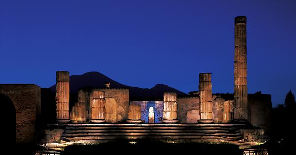 A Pompei, entrando da Porta Marina si potrà visitare l’area monumentale del Foro Civile - illuminata a cura di Enel Sole e con un accompagnamento sonoro di sottofondo- dove si affacciano tutti i principali edifici pubblici per l’amministrazione della città e della giustizia, per la gestione degli affari, per le attività commerciali, come i mercati, oltre ai principali luoghi di culto cittadino. Il percorso si conclude con la visita all’Antiquarium, edificio dell’’800 che ospita uno spazio museale dedicato all'esposizione permanente di reperti che illustrano la storia di Pompei. Uscita da Piazza Esedra.