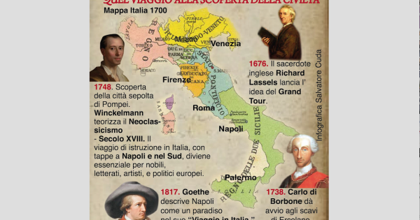 Il Grand Tour del’ 700 era un grande giro per l’Europa di allora, quella occidentale, per conoscere il mondo. E le famiglie nobili vi mandavano - accompagnata da un tutore e un valletto - anche la prole, per completare la sua istruzione. Da questi tour, che arricchivano anche i rapporti sociali, nasceva una particolare letteratura, quella dei resoconti di viaggi, dei diari e delle lettere, in cui si affermava uno stile più efficacemente descrittivo. Meta del Grand Tour era soprattutto l’Italia. Partivano da Calais molti viaggiatori inglesi ma numerosi erano anche i francesi e i tedeschi. La meta più conosciuta era Roma, luogo santo e famoso fin dal Medio Evo, quando vi si ricercavano le rovine degli antichi monumenti, le Mirabilia Urbis. Marie Henri Beyle, il romanziere conosciuto come Stendhal (1783-1842), affascinato da Napoleone, lo aveva seguito a Parigi, Vienna e Mosca, per poi, adattandosi alla Restaurazione, divenire Console di Ravenna. Da qui, facilmente, raggiungeva Roma, che visitò sei volte. Ce la descrive nelle sue Passeggiate Romane: racconta che dapprima gli era parsa un luogo brutto, triste e disabitato, per poi sentire il fascino della sua grandiosità. Anche la Roma moderna, descritta in pittura da Giovanni Paolo Pannini (1691-1766) e da Giovan Battista Piranesi (1720-1778), conserva la sua monumentalità. Da Roma ci si allungava nel Regno di Napoli e Sicilia, prima di ritornare al Nord, spesso con una deviazione verso l’Adriatico, per visitare Venezia. Ci si fermava più a lungo a Napoli, la vivacissima città che, con Londra e Parigi, era di gran lunga la più popolosa d’Europa. L’antica capitale era già stata visitata da personaggi famosi come Dante Alighieri (1265-1321), che vi si era recato due volte, Francesco Petrarca (1304-1374), Giovanni Boccaccio (1313-1375) e tanti altri. Nel maggio del 1770, vi si recò, giovanissimo, Wolfgang Amadeus Mozart (1756-1791), che non vi ebbe il successo sperato. Troppi erano, a Napoli, i geni musicali, dagli Scarlatti a Paisiello, da Francesco Durante a Nicola Porpora, Niccolò Jommelli, Domenico Cimarosa... Napoli era la patria della musica, e anche del teatro, dei poeti, letterati, filosofi, architetti, scultori, pittori. Per le sue strade si potevano incontrare il filosofo Giambattista Vico (1668-1744), il santo Alfonso de’ Liguori (1696-1787) e l’architetto Ferdinando Sanfelice (1675-1748), che si salutavano l’un l’altro. E c’erano artigiani ceramisti, sarti, calzolai, che praticavano arti che fino a non molto tempo fa, qui ancora avevano la loro dignità. La città attirava anche per le sue bellezze naturali: il golfo, i Campi Flegrei e il Vesuvio con le sue eruzioni, che stimolò l’interesse scientifico anche dell’esperto Lord William Douglas Hamilton (1730-1803), ambasciatore del Regno Unito, a lungo di stanza a Napoli. La fama della città fu accresciuta da scoperte straordinarie: nel 1738 quella di Ercolano, nel 1748, quella di Pompei, che suscitarono l’interesse di Johann Joachim Winckelmann (1717-1768), il quale teorizzò quel Neoclassicismo che avrebbe invaso il mondo. Tanti furono gli artisti che illustrarono Napoli, dipingendo quelle vedute che, con la loro originale prospettiva, resero lo spirito e l’anima della città. Tanti furono i turisti che la decantarono. Tra questi, Johann Wolfgang van Goethe (1749-1832), che la dipinse come un paradiso, “in cui si vive in una sorta di ebbrezza e di oblio di se stessi”, e “ci si sente liberi, perché ognuno segue la propria strada”. Ma Goethe scrisse la sua opera nel 1817, più di 20 anni dopo il suo soggiorno napoletano (1787-88), con la nostalgia di un tempo che non sarebbe più tornato. C’era stata la Rivoluzione e il mondo in cui aveva creduto era svanito nel nulla.