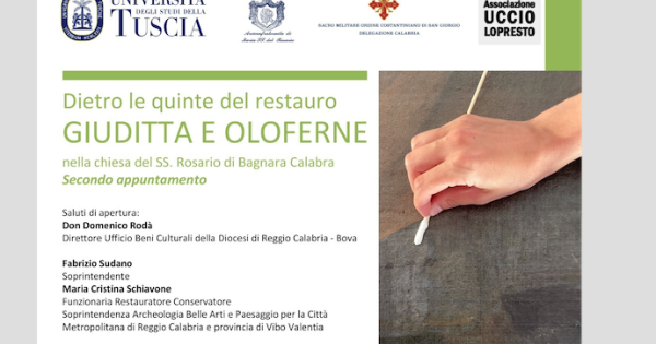 BAGNARA CALABRA. Il restauro del dipinto di scuola napoletana del '700 “Giuditta e Oloferne”, attribuito all’allievo del Caravaggio Paolo De Matteis, in corso nella chiesa del SS. Rosario a Bagnara Calabra (Reggio Calabria) a cura di un’ équipe dell’Università della Tuscia dovrebbe concludersi ai primi di ottobre. I restauratori, guidati dalla prof.ssa Paola Pogliani, faranno il punto sullo stato del lavoro in un convegno (”Dietro le quinte del restauro”) mercoledì 23 agosto alle 21, nei locali dell’ Arciconfraternita del SS. Rosario. Vi parteciperanno i componenti dell’équipe del restauro (Anna Arcudi, e le studentesse calabresi Chiara Campanella e Azaria Rovere). Il restauro del quadro è oggetto della loro tesi di laurea, che sarà discussa a conclusione del lavoro.