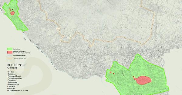 Dieci sono i Comuni coinvolti e gravitanti nel territorio della nuova Buffer Zone, che oggi raggiunge un’estensione complessiva di 17,26 kmq comprendente Portici, Ercolano, Torre del Greco, Torre Annunziata, Boscoreale, Boscotrecase, Terzigno Trecase, Pompei e Castellammare di Stabia a fronte degli originari 0,24 kmq che interessavano i soli Comuni di Pompei, Torre Annunziata ed Ercolano nel 1997.