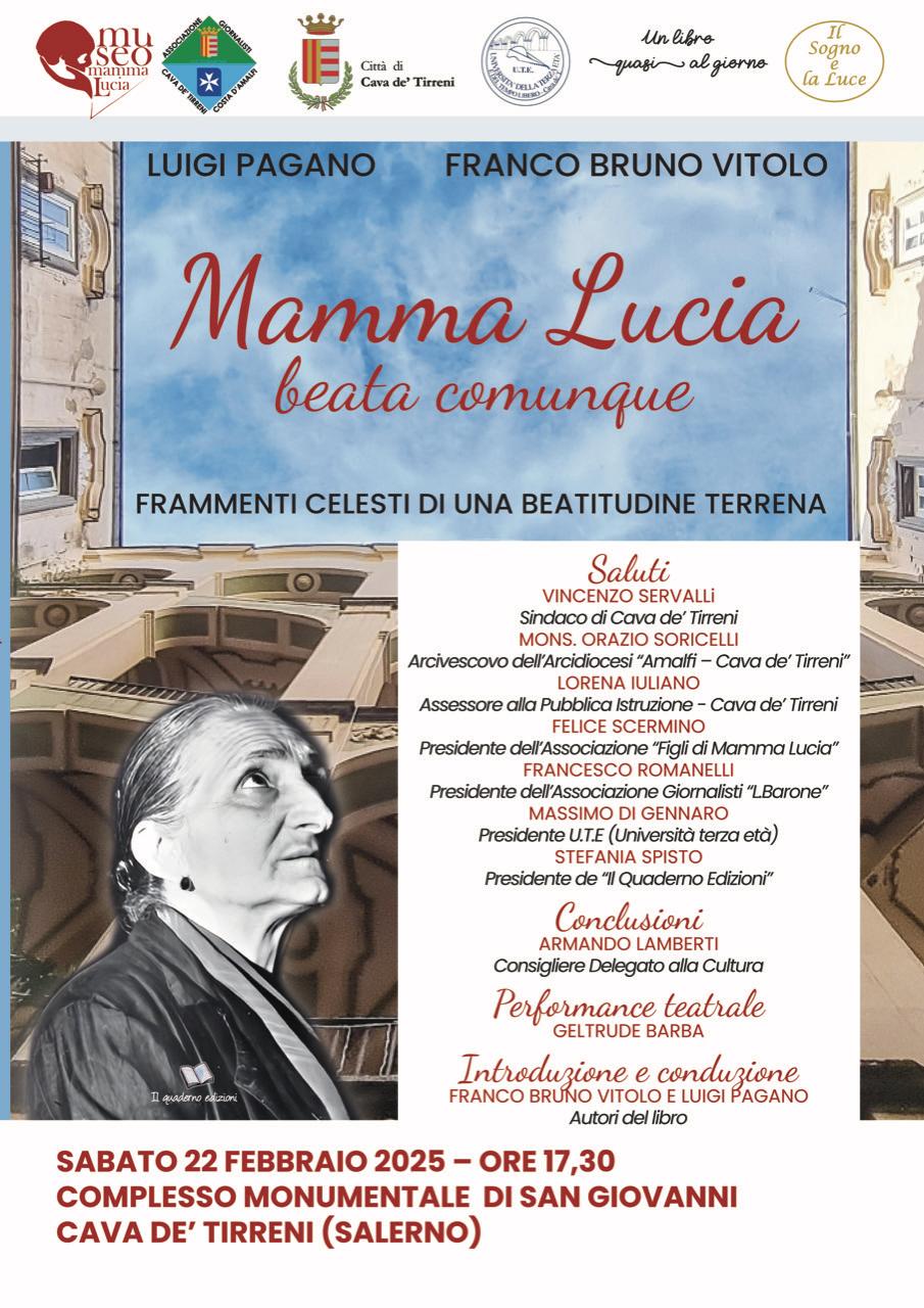 CAVA DE' TIRRENI.Nell’ambito della Rassegna “Un libro (quasi) al giorno” (promossa dal Consigliere delegato alla Cultura, Armando Lamberti) ed a chiusura ideale della serie di eventi natalizi “Il sogno e la Luce”, sabato 22 febbraio 2025, alle ore 17,30, a Cava de’ Tirreni, nel Complesso Monumentale di San Giovanni in Corso Umberto, sarà presentato il libro “Mamma Lucia, Beata comunque - Frammenti celesti di una beatitudine terrena” (Il Quaderno ed.), di Luigi Pagano e Franco Bruno Vitolo. Interverranno per saluti e contributi il Sindaco di Cava Vincenzo Servalli, l’Arcivescovo dell’Arcidiocesi Amalfi-Cava de’ Tirreni Mons. Orazio Soricelli, il Consigliere Delegato alla Cultura Armando Lamberti, l’Assessore alla Pubblica Istruzione Lorena Iuliano, il Presidente dell’Associazione “Figli di Mamma Lucia” Felice Scermino, il Presidente dell’Associazione Giornalisti “Lucio Barone” Francesco Romanelli, il Presidente dell’Università della Terza Età Massimo Di Gennaro, l’Editrice Stefania Spisto, l’attrice Geltrude Barba per una performance teatrale. Introdurranno e condurranno Luigi Pagano e Franco Bruno Vitolo, autori del libro.