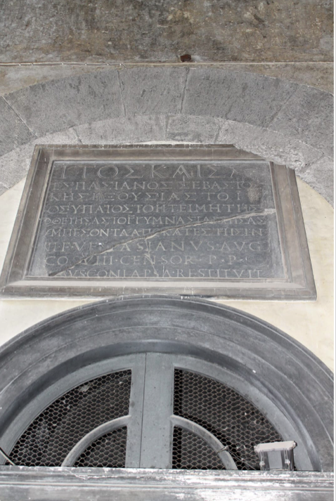 1) Basilica dell’Annunziata Maggiore. Iscrizione in greco e latino che ricorda il restauro del Ginnasio, luogo di formazione dei giovani e ritrovo sociale e culturale, legato all’identità greca della città, ad opera di Tito, figlio dell’imperatore Vespasiano Augusto