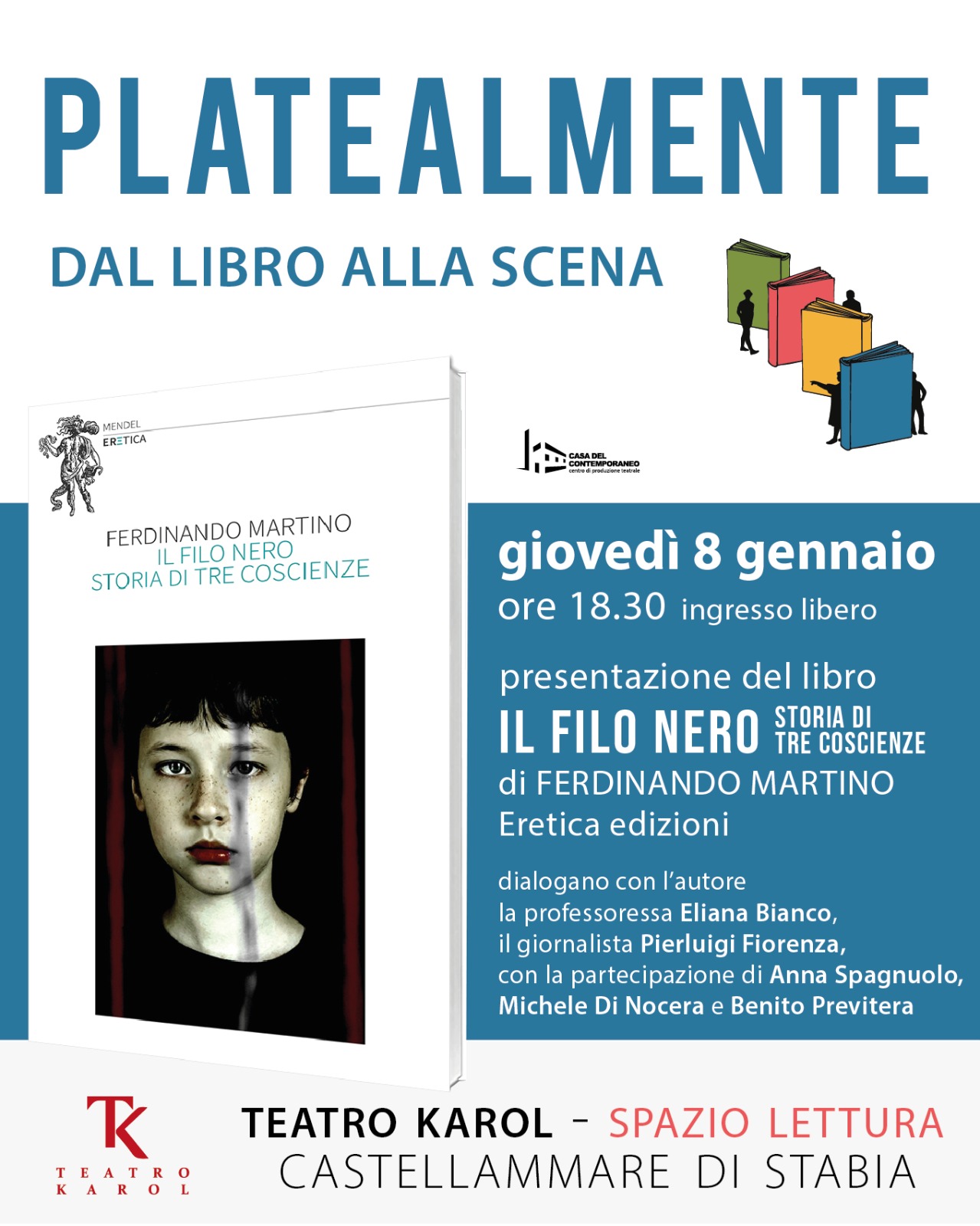 CASTELLAMMARE DI STABIA. Riparte al Teatro Karol di Castellammare di Stabia la rassegna PLATEALMENTE – Dal libro alla scena che il giornalista Pierluigi Fiorenza e la professoressa Eliana Bianco curano nell’ambito della più ampia proposta culturale di Casa del Contemporaneo. Ospite giovedì 8 gennaio (ore 18:30) Ferdinando Martino in dialogo con il pubblico intorno all’ultimo romanzo "IL FILO NERO. Storia di tre coscienze", Eretica Edizioni. Sul palco anche tre ospiti d’eccezione Anna Spagnuolo, Michele di Nocera, Benito Privitera.