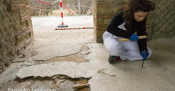 ERCOLANO. Parte il cantiere di restauro della Casa dell'Albergo. Questa mattina i restauratori hanno cominciato il distacco del pavimento di un grande ambiente di soggiorno della casa (oecus). Si tratta di un mosaico imponente, con una superficie di circa 20 mq, che sarà rimosso dal piano originario e collocato su 10 pannelli componibili, così da intervenire nel risanamento del sottofondo e nella pulitura delle tessere presso un piccolo laboratorio appositamente allestito all’interno del Parco, presso la Casa di Argo sul III Cardo Inferiore. Terminato il restauro il mosaico ritornerà nella sua sede originaria.
