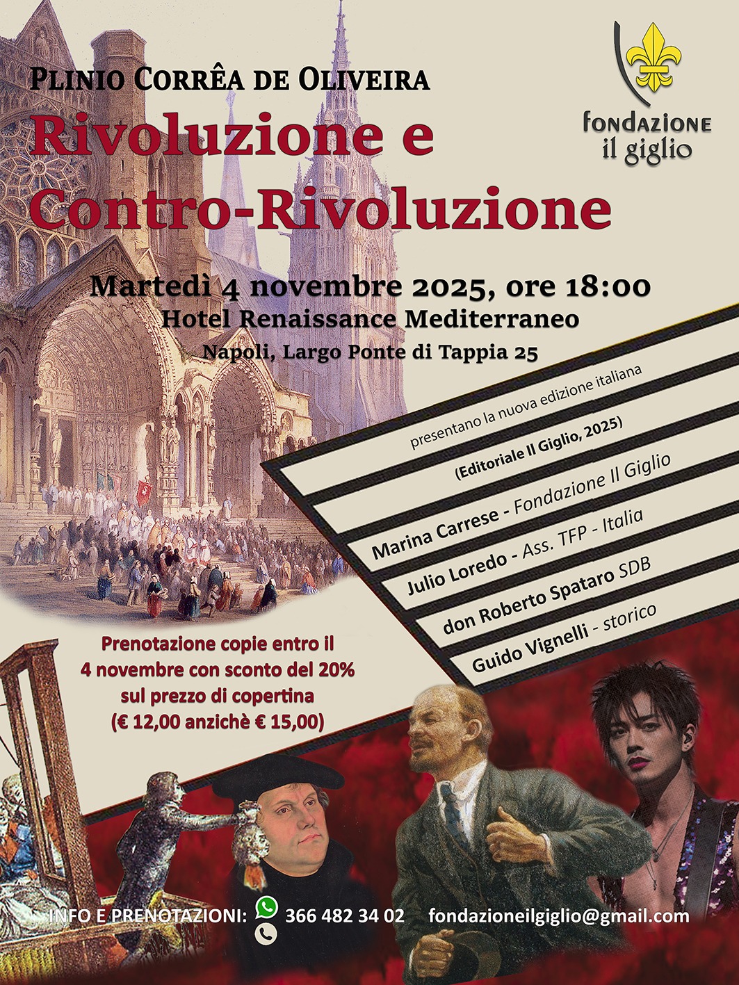 NAPOLI. La nuova edizione italiana di “Rivoluzione e Contro-Rivoluzione”, saggio di Plinio Corrêa de Oliveira sulla crisi dell’Occidente cristiano e sull’azione necessaria ad affrontarla (Editoriale il Giglio, Napoli 2025), sarà presentata martedì 4 novembre (ore 18) all’Hotel Renaissance Mediterraneo.