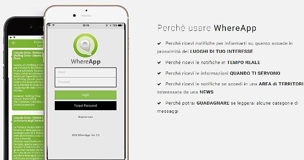 Sbarca sul web la nuova app gratuita Whereapp prodotta da una startup romana "VJ Technology" con il contributo di alcuni giovani partenopei.Whereapp non è una semplice app informativa, bensì un nuovo servizio che comunica solo nella zona geografica selezionata dall'utente. Per questo motivo le pubbliche amministrazioni, gli enti, e le grandi aziende stanno registrando particolare attenzione nei confronti del servizio innovativo. Ecco alcuni esempi di comunicazioni di pubblica utilità da trasmettere sugli smartphone in tempo reale: incendi, allerta meteo, interruzioni elettriche, idriche e di gas, lavori stradali e manifestazioni.