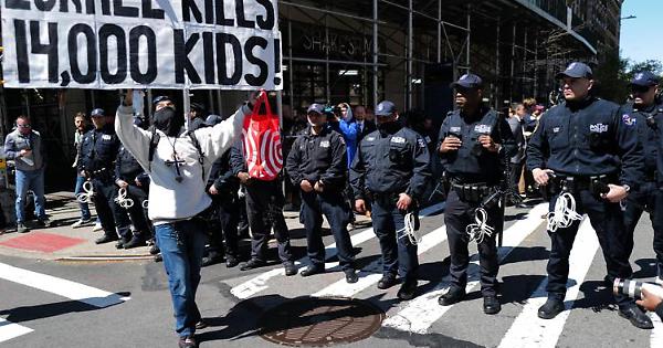 A Gould Plaza, vicino alla New York University, gli agenti sono intervenuti per smontare un accampamento allestito dai manifestanti provocando scontri. Un portavoce della polizia di New York ha detto che gli arresti sono stati effettuati dopo che l'università ha chiesto alla polizia di far rispettare la legge sulla violazione di domicilio, ma il numero totale di arresti non è chiaro. Il giornale studentesco Washington Square News ha riferito che la polizia di New York ha annunciato tramite un altoparlante che gli studenti sarebbero stati arrestati per "condotta disordinata" e che i manifestanti stavano bloccando illegalmente il traffico.