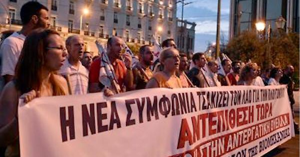 Intanto migliaia di persone si sono riunite questa sera a piazza Syntagma, davanti al parlamento di Atene, per protestare contro le misure comprese nell'accordo con i creditori che dovrà essere approvato nella notte. La protesta è stata convocata dal sindacato comunista Pame e da quello dei dipendenti pubblici Adedy.