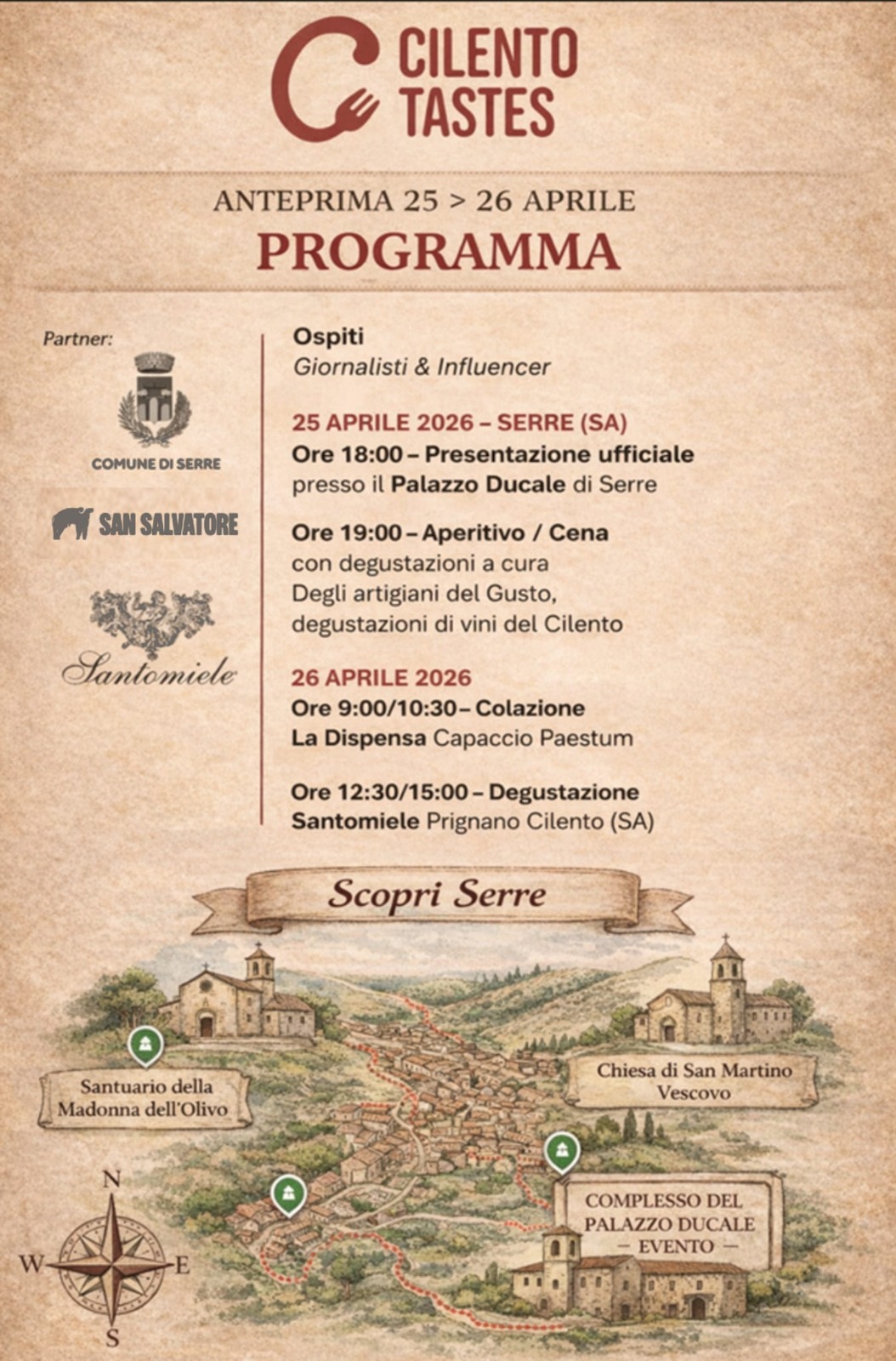 SALERNO. E' già pronto il programma del "Cilento Tastes 2026" che si terrà nei giorni 25 e 26 aprile prossimi. La primavera è alle porte e il Palazzo Ducale di Serre apre agli ospiti per dare avvio a due giorni di degustazioni a cura degli Artigiani del Gusto e i produttori di vino del territorio.