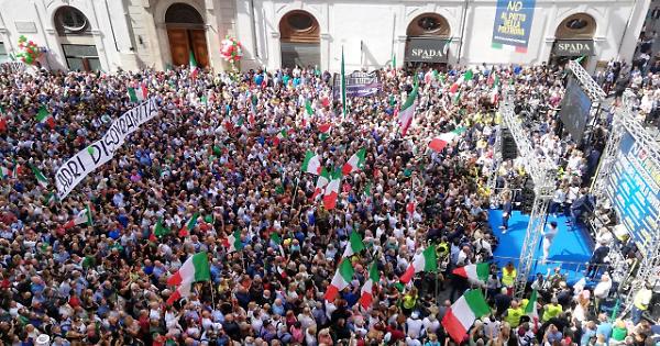 "Renzi, Di Maio, fuori dai c..., il popolo vuole libere elezioni", è uno degli slogan che si alzano, mentre sul palco si alternano a parlare politici e amministratori locali del partito di Giorgia Meloni. Tutti chiedono "elezioni subito, contro i ladri di poltrone" . Non viene risparmiato il premier Conte, a cui vengono indirizzati fischi e cori 'buffone-buffone'.