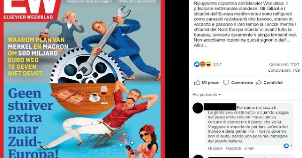«Ripugnante copertina dell'Elsevier Weekblad, il principale settimanale olandese. Gli italiani e i cittadini dell'Europa mediterranea sono raffigurati come parassiti nullafacenti che bevono, stanno in vacanza e passano il loro tempo sui social mentre i cittadini del Nord Europa mandano avanti tutta la baracca, lavorano duramente e senza fermarsi mai». Lo scrive su Facebook il presidente di Fratelli d'Italia, Giorgia Meloni.