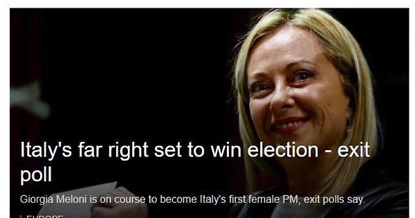 "L'estrema destra verso la vittoria alle elezioni". E' il titolo della breaking news della Bbc, secondo cui "Giorgia Meloni si avvia essere la prima premier donna in Italia, secondo gli exit poll". L'emittente britannica ricorda che un'Italia guidata dalla Meloni "allarmerà buona parte dell'Europa", mentre continua la guerra russa in Ucraina.