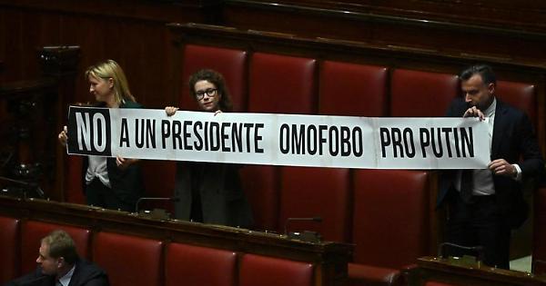 'No a un presidente omofobo pro Putin' è lo striscione che hanno esposto sui banchi dell'aula di Montecitorio Alessandro Zan e Rachele Scarpa, del Pd, appena iniziata la seduta per l’elezione del presidente. Gli assistenti parlamentari, intervenuti prontamente, hanno sequestrato lo striscione, chiaramente riferito a Lorenzo Fontana.