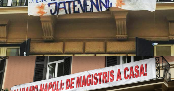 MANIFESTO PRO SINDACO. Un altro striscione, questa volta a sostegno del sindaco de Magistris è stato esposto su uno dei balconi del consiglio comunale. Sul telo, rimosso dopo pochi minuti, c'era scritto “Lega Nord e Pd alleati per il fallimento di Napoli! Jatevenne". L'iniziativa è stata adottata probabilmente in riposta all'esposizione dalla mattinata di un altro striscione contro il sindaco. I due fanno seguito ad un terzo striscione che da giorni è esposto sulla facciata di palazzo San Giacomo sede del Municipio con la scritta: "No al debito ingiusto, Napoli libera!".