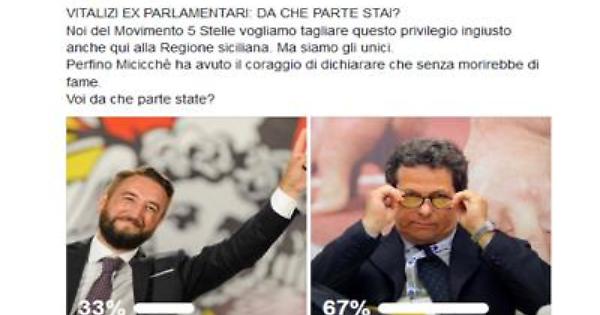"Noi del Movimento 5 Stelle - recita il post pubblicato nella giornata di ieri - vogliamo tagliare questo privilegio ingiusto anche qui alla Regione siciliana. Ma siamo gli unici. Perfino Micicchè ha avuto il coraggio di dichiarare che senza morirebbe di fame. Voi da che parte state?". La risposta, anche stavolta, non si è fatta attendere e la percentuale - complice anche 'l'intrusione' di alcune pagine satiriche che hanno rilanciato il sondaggio, invitando i loro fan a votare - è volata in favore dell'opzione "teniamo i privilegi".