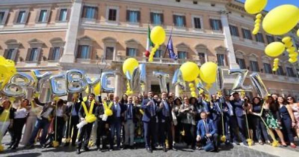 Per festeggiare il via libera della Camera i parlamentari del M5S sono usciti in piazza Montecitorio con palloncini gialli. "Oggi è un giorno storico - afferma il capogruppo a Montecitorio Francesco D'Uva, stappando una bottiglia di spumante a pochi passi dal portone di ingresso del palazzo - non solo per il M5S ma per l'Italia tutta. Il M5S è arrivato al governo, ha la maggioranza e ha subito abolito questo assurdo privilegio della casta". 'Bye bye vitalizi' è la scritta apparsa davanti a Montecitorio, riportata su palloncini argento che sventolano tra i palloncini gialli tenuti in aria dei parlamentari M5S.