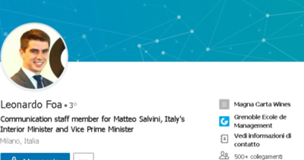 Sul social Linkedin, utilizzato soprattuto in ambito professionale, spunta un profilo di Leonardo Foa. Profilo che sembrerebbe corrispondere al figlio del presidente della Rai "bocciato" dalla commissione di Vigilanza, Marcello Foa. Leonardo si qualificherebbe, in inglese, come "Membro dello staff di comunicazione, ministro dell'Interno e vice premier d'Italia'". Lo screenshot del profilo sta girando sul web.