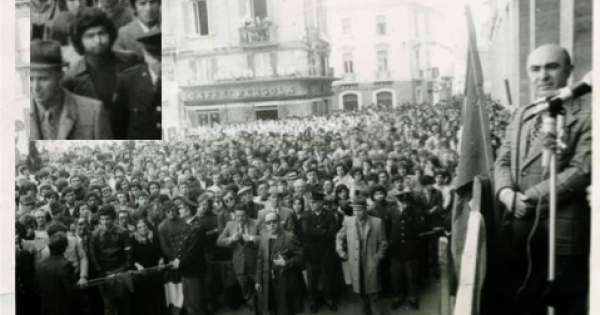 Piazza Prefettura a Potenza ad un comizio di Giorgio Almirante. Trerotola non è un passante, un curioso, ma è posizionato proprio in prima fila. Dunque un segno inequivocabile della militanza nelle file dell’MSI di Almirante.