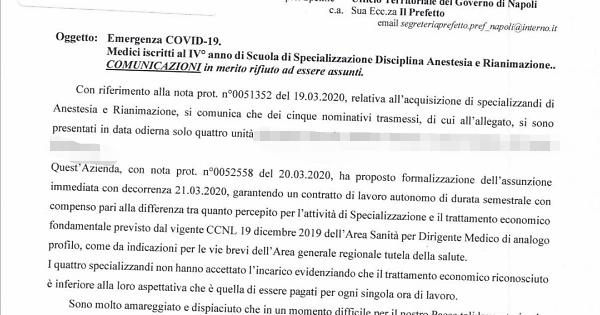 NAPOLI. Hanno rifiutato l'assunzione offerta dall'Asl Napoli 1 perché il compenso era secondo loro troppo basso: “Tanto a noi ci assumono le altre regioni e ci pagano quanto vogliamo”. Indignato il direttore generale Ciro Verdoliva. “Un comportamento vergognoso, sono molto amareggiato e dispiaciuto”, ha scritto Verdoliva in una nota inviata al governatore Vincenzo De Luca, al prefetto e al direttore della sanità campana Antonio Postiglione. L'Asl, infatti, cercava di assumere specializzandi anestesisti alla luce dell'emergenza Coronavirus. “Dei 5 nominativi trasmessi si sono presentati solo 4 - scrive Verdoliva - Quest’azienda ha proposto la formalizzazione dell’assunzione immediata con decorrenza 21 marzo, garantendo un contratto di lavoro autonomo di durata semestrale con compenso pari alla differenza tra quanto percepito per l’attività di specializzazione e il trattamento economico formalmente previsto dal vigente contratto nazionale dell’area sanità per dirigente medico di analogo profilo”. Verdoliva scrive di essere "molto amareggiato e dispiaciuto che in un momento difficile per il nostro Paese tali lavoratori - che rappresentano con la loro professionalità una categoria indispensabile a vincere la guerra contro il covid-19 - anziché correre alle armi pongono una questione economica al rialzo rispetto all'offerta adeguata a quanto percepiscono i dirigenti anestesisti già in servizio da noi, e respinta affermando che "tanto a noi ci assumono le altre regioni e ci pagano quanto vogliamo. Rimetto a voi ogni valutazione consequenziale oltre alla commiserazione per tale vile e vergognoso comportamento di tali professionisti che dovrebbero rappresentare il futuro del nostro Paese".