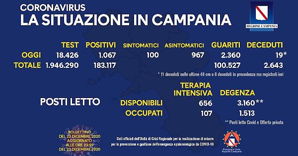 NAPOLI. Sono 1.067 i nuovi casi di Covid-19 in Campania, 276 in più rispetto al dato diffuso nel bollettino di martedì, dall’analisi, però, di 18.426 tamponi che fanno segnare un incremento di 8.241 unità. Dei nuovi casi, solo cento sono sintomatici. La percentuale tra test e positivi è del 5,7 per cento rispetto al 7,7 precedente. Il totale dei casi di nuovo Coronavirus dall’inizio dell’emergenza sale a 183.117 mentre i tamponi analizzati sono 1.946.290. Nel bollettino dell’Unità di crisi della Regione Campania sono inseriti 19 nuovi decessi, sei in meno del giorno precedente: si specifica che undici di questi sono avvenuti in 48 ore e il resto in precedenza ma registrati alla mezzanotte di martedì. Il totale delle vittime del Covid-19 dall’inizio della pandemia è di 2.643. Sono 2.360, invece, i nuovi guariti, 679 in meno rispetto al giorno precedente per un totale di 100.527. I pazienti colpiti da Covid ricoverati in terapia intensiva, su 656 posti disponibili, sono 101, undici in meno di martedì, mentre i posti letto di degenza occupati, su 3.160 disponibili e comprendenti quelli privati, sono 1.513, con un decremento di tredici.