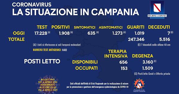 NAPOLI. Sono 1.908 i nuovi positivi al Covid in Campania, di cui 635 sintomatici, su 17.228 tamponi molecolari analizzati. Il tasso di positività è dell'11,07%, in lieve calo rispetto all'11,9 di ieri. Ci sono anche 1.019 guariti e 7 decessi, in diminuzione netta rispetto alle ultime settimane. I posti letto occupati in terapia intensiva sono 153, uno più di ieri, mentre quelli di degenza diminuiscono di ben 68 unità, attestandosi a 1.509.