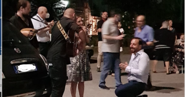 CASTELLAMMARE DI STABIA. La voce di Manuel Sammartino, bravissimo, diplomato al conservatorio di Avellino, scout, ha distolto ieri sera i tifosi della Nazionale in campo per gli Europei contro la Svizzera. Non è usuale sentire sotto il balcone di casa una serenata di antiche canzoni napoletane cantate come si deve, in una tiepida notte di inizio estate. C'era uno spicchio di luna e il silenzio giusto con i profumi della natura, per godersi la posteggia. E c'era un "Oi Marì, oì Marì" che richiamava l'attenzione di una promessa sposa... La voce appassionata di Manuel, acccompagnata dalla chitarra classica era tutta per Valeria Donnarumma e per il suo sposo, Eduardo Di Stefano che tra qualche ora si diranno il loro "sì" sull'altare della Chiesa San Marco, a Castellammare di Stabia. Una festa improvvisata che ha radunato gli amici e i parenti degli sposi sotto casa dei "promessi" e ha costretto Eduardo a inginocchiarsi davanti alla sua amata per cantarle la seconda strofa di " 'o surdato 'nnammurato ", tra gli applausi dei presenti che, dopo hanno brindato e salutato i dolci innamorati con un pasticcino augurale... tra poco si giureranno amore eterno. Anche Valeria e Eduardo sono ex scout... Auguri agli sposi dalla redazione del Roma.