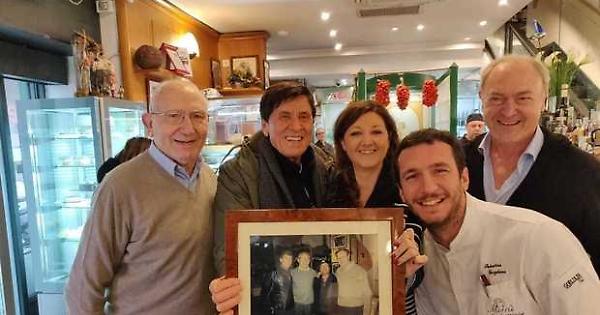 NAPOLI. E' tornato a trovare i vecchi amici appena arrivato in città. Gianni Morandi, infatti, si e recato nello storico ristorante "Mimì alla ferrovia" dove, tra una pietanza e l'altra, si è fatto fotografare con in mano uno scatto di 16 anni fa che lo ritrare, nello stesso ristorante, con il grande amico Lucio Dalla e i giovani Michele Giugliano senior e junior, che oggi dirigono il ristorante nei pressi di piazza Garibaldi insieme ai rispettivi figli Salvatore e Ida. Inoltre, a Morandi e a sua moglie Anna sono stati regalati pomodorini del piennolo, che il cantautore e la consorte hanno tanto apprezzato: "Se ci aveste regalato gioielli non ci avreste fatto altrettanti felici. Questa è una materia prima introvabile che noi amiamo".