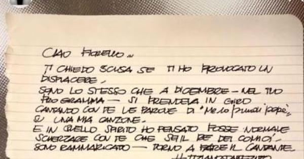 Così Tiziano Ferro chiede scusa su Instagram a Fiorello dopo che ieri sera aveva lanciato l'hashtag #fiorellostattezitto, seguito oggi dal contro-hashtag '#fiorelloparlaquantovuoi' di Amadeus. Il cantautore ha pubblicato il biglietto che oggi ha lasciato nel camerino di Fiorello. "Oggi Fiorello non c'era e quindi gliel'ho lasciato in camerino. Ma domani spero di dirglielo anche a voce", aggiunge Ferro, che annota in un p.s: "Scusa la scrittura ma in corsivo faccio ancora più schifo".