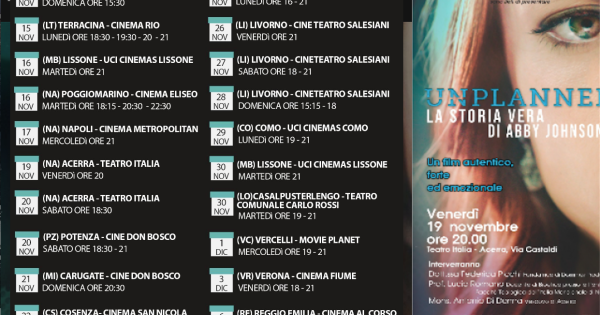 POGGIOMARINO. Fa registrare già il tutto esaurito in sala la proiezione delle ore 21 di domani all’Eliseo di Poggiomarino. “Unplanned” è programmato in tre orari: alle 18,15, alle 21 e alle 22,30 perché si prevede sold-out per il film che - solo con il passaparola - ha sbancato negli Stati Uniti perché racconta la storia vera di Abby Johnson, ex dipendente della multinazionale dell’aborto “Planned parenthood” degli Stati Uniti, poi diventata attivista pro-life, dopo avere visto da vicino ciò che accade nei momenti in cui si aziona l’aspiratore per interrompere una gravidanza “indesiderata”. Alla serata evento, in tutte e tre le proiezioni che si terranno martedì a Poggiomarino (altre date al Metropolitan di Napoli il 17 novembre ore 21 e replica il 22 stessa ora; Acerra - Teatro Italia, il 19 novembre ore 21), sarà presente Federica Picchi, la giovane imprenditrice della “Dominus Production” che ha deciso di farsi carico della distribuzione del film di cui, due anni fa ha acquistato i diritti per l’Italia.