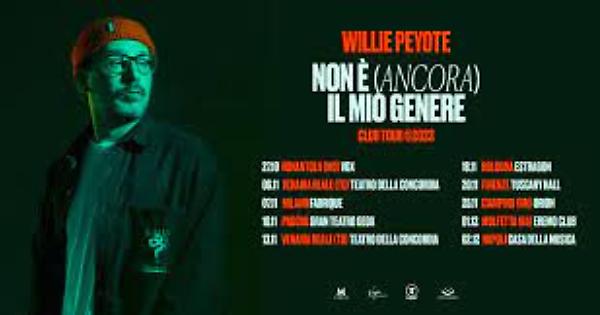 Continua il successo del “Non è (ancora) il mio genere” Club Tour 2023 di Willie Peyote che questa sera arriva sul palco della Casa della Musica per l’ultimo imperdibile appuntamento. Il cantautore torinese sta portando insieme alla sua band il suo sound e le sue rime inconfondibili nei più importanti club italiani con un tour che ha già registrato il tutto esaurito in numerose tappe lungo la penisola. Il tour è l’occasione per Willie di portare sul palco i brani che da anni scaldano il pubblico oltre al nuovo singolo “Frecciarossa” pubblicato a settembre, e “Picasso” uscito maggio. I due brani inediti arrivati dopo la pubblicazione dell’ultimo disco “Pornostalgia” e proseguono nel viaggio che Peyote ha intrapreso all’inizio della sua carriera con la scelta di pubblicare brani che permettessero al pubblico di muoversi e al contempo riflettere grazie a testi per niente banali (anche laddove il tema poteva indurre a crederlo).