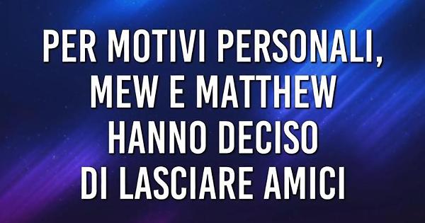"Per motivi personali Mew e Matthew hanno deciso di lasciare Amici". Questa la comunicazione apparsa sul teleschermo nel finale della puntata quotidiana di 'Amici' di Maria De Filippi, andata onda oggi pomeriggio su Canale 5. La notizia è rapidamente rimbalzata su tutti i social, dove il talent è seguitissimo e molto commentato.