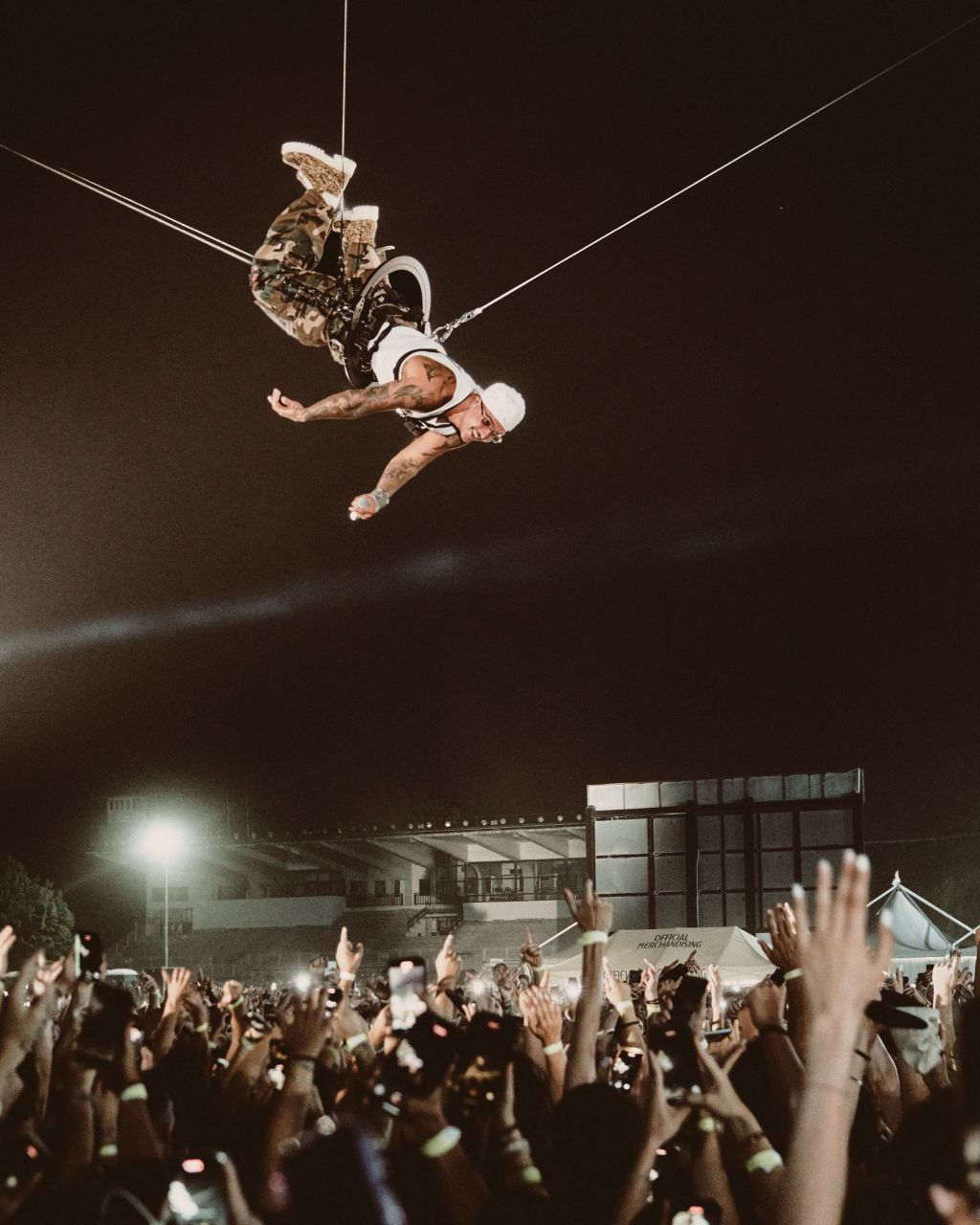 Subito dopo il cielo è tornato protagonista. Il sistema di volo 3D ha sollevato Geolier a 15 metri d’altezza, permettendogli di fluttuare sopra l’intera Yellow Zone. Da lassù ha cantato “Campioni in Italia” e “P Secondigliano”, tra le mani tese dei fan che lo vedevano passare sopra le teste. Non si è trattato solo di un effetto scenico. La scelta del volo nasce dalla volontà precisa di abbracciare simbolicamente ogni persona presente, senza divisioni, senza aree privilegiate, senza pass speciali.