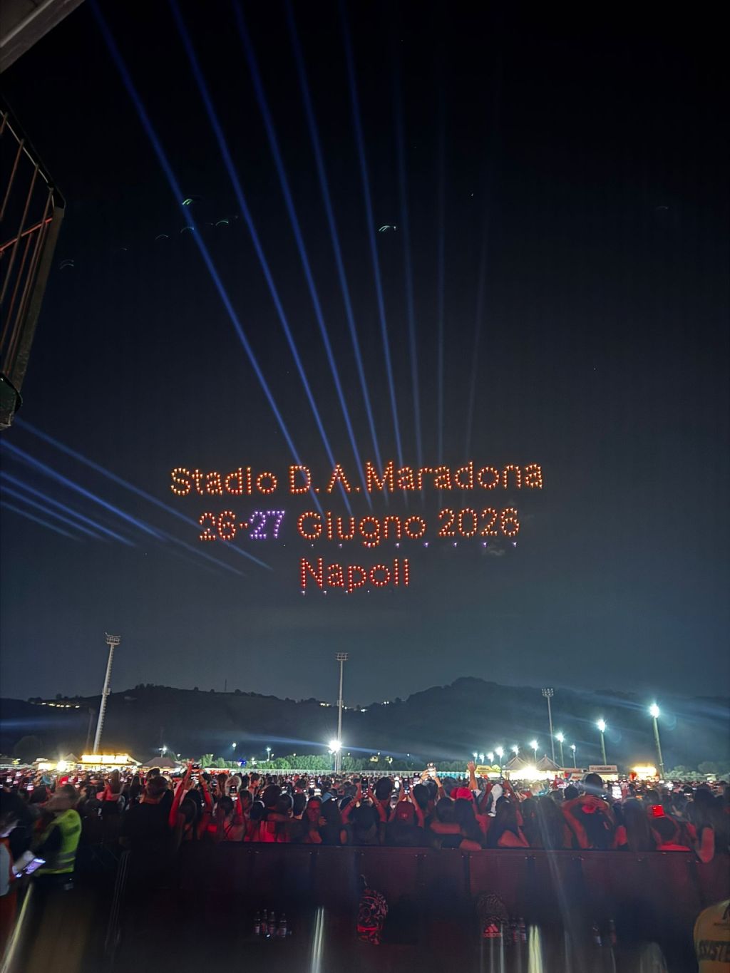 Dopo il brano, si è alzato nel cielo di Agnano lo spettacolo del drone show, riproposto con la stessa potenza del 25 luglio: cinquecento droni hanno composto in sequenza immagini iconiche come la “G”, la scritta “Geolier”, il profilo del golfo con il Vesuvio, Maradona e, tra tutte, la data del 26 giugno 2026 allo Stadio Diego Armando Maradona, accolta da un fragoroso boato. Un passaggio che segna già il futuro, dando forma a un sogno collettivo.